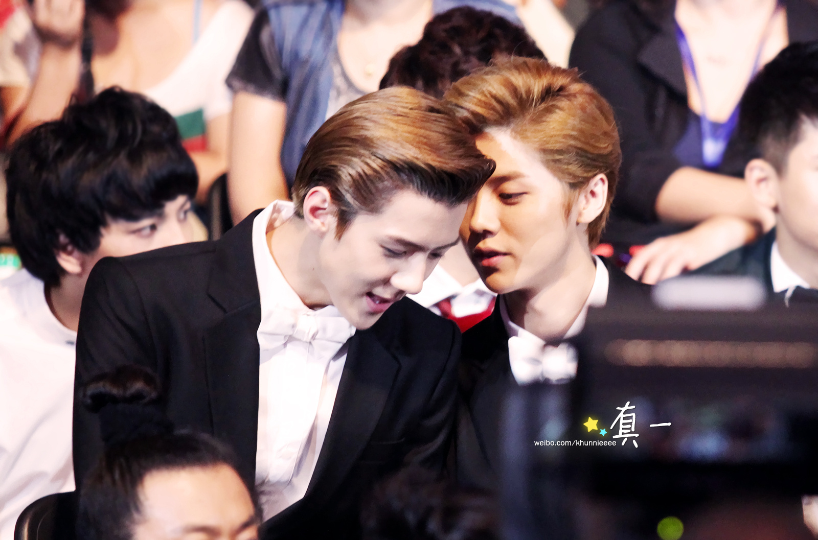 HunHan liên tục thân mật, viết lên tay đối phương để trò chuyện khi cùng tham gia Lễ trao giải âm nhạc Mengniu năm 2012. Nguồn: YouTube