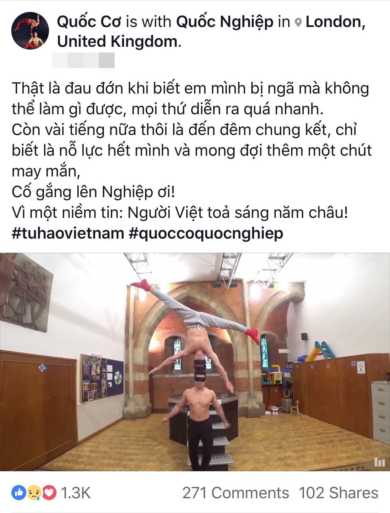 Trước đó, trên trang Facebook cá nhân, Quốc Cơ chia sẻ Quốc Nghiệp bị ngã nhưng không thể làm được gì cho em mình vì mọi thứ diễn ra quá nhanh. Khi chỉ còn vài tiếng nữa là đến chung kết, hai anh em chỉ biết nỗ lực hết mình và trông chờ vào sự may mắn.