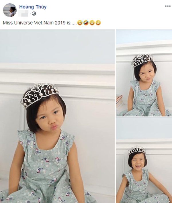 Không lên tiếng thừa nhận, tuy nhiên ứng cử viên “nặng ký” này cũng rất hài hước khi “hack não” fan bằng đăng tải “hé lộ” đại diện Miss Universe 2019. Hóa ra là một cô bé đang đội chiếc vương miện trên đầu và tạo dáng nhí nhố đáng yêu. Vừa chia sẻ đang rất hồi hộp đợi đến giờ công bố, có lẽ đây là cách để Hoàng Thùy giúp bản thân đỡ căng thẳng