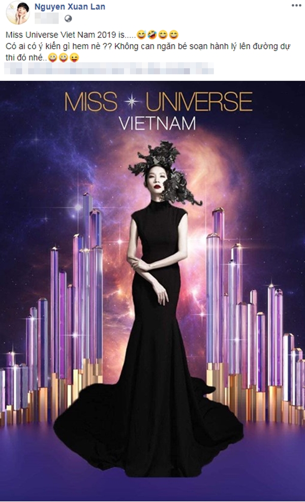 Thế nhưng độ “mặn mà” thì “chị đại” Xuân Lan mới gọi là vô địch thiên hạ ghi ghép hẳn ảnh của mình vào poster công bố đại diện Việt Nam tại Miss Universe 2019. Siêu mẫu hài hước chia sẻ: “Có ai ý kiến gì hem nè?? Không can ngăn bé soạn hành lý lên đường dự thi đó nhé“. Đăng tải của cô khiến cư dân mạng cực kỳ thích thú, trước đó Xuân Lan cũng là người đoán đại diện Việt Nam không ai khác chính là Hoàng Thùy.