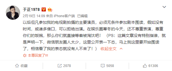 Cụ thể Vu Chính đăng weibo tuyên bố sau này nếu nghệ sĩ tham gia đóng phim do anh sản xuất thì phải đến đọc kịch bản cùng đoàn làm phim một cách vô điều kiện: “Nếu không có thời gian hoặc thích đưa ra những lời biện minh cho việc không đọc kịch bản thì có thể từ chối diễn. Trong cái lạnh của giới giải trí ngày hôm nay, không tôn trọng việc biểu diễn, tôn trọng bát cơm của các bạn thì các bạn cứ đợi mà bị đào thải đi”. Vu Chính cũng cho biết bài đăng này không nhắm đến bất kỳ ai, chỉ là muốn đưa ra thông báo thôi.