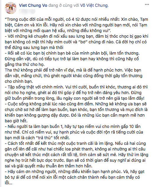 Cụ thể, anh viết: “Hãy nói xin chào với những người bạn mới, nói Tạm biệt với những mối quan hệ xấu, những điều không vui. Cách tốt nhất để kết thúc một cuộc tranh cãi là im lặng. Nếu cả hai cùng gân cổ lên để cãi như hai chiếc loa phát thanh, không ai nhường ai thì câu chuyện sẽ kết thúc một cách rất tồi tệ, tình cảm sẽ sứt mẻ.