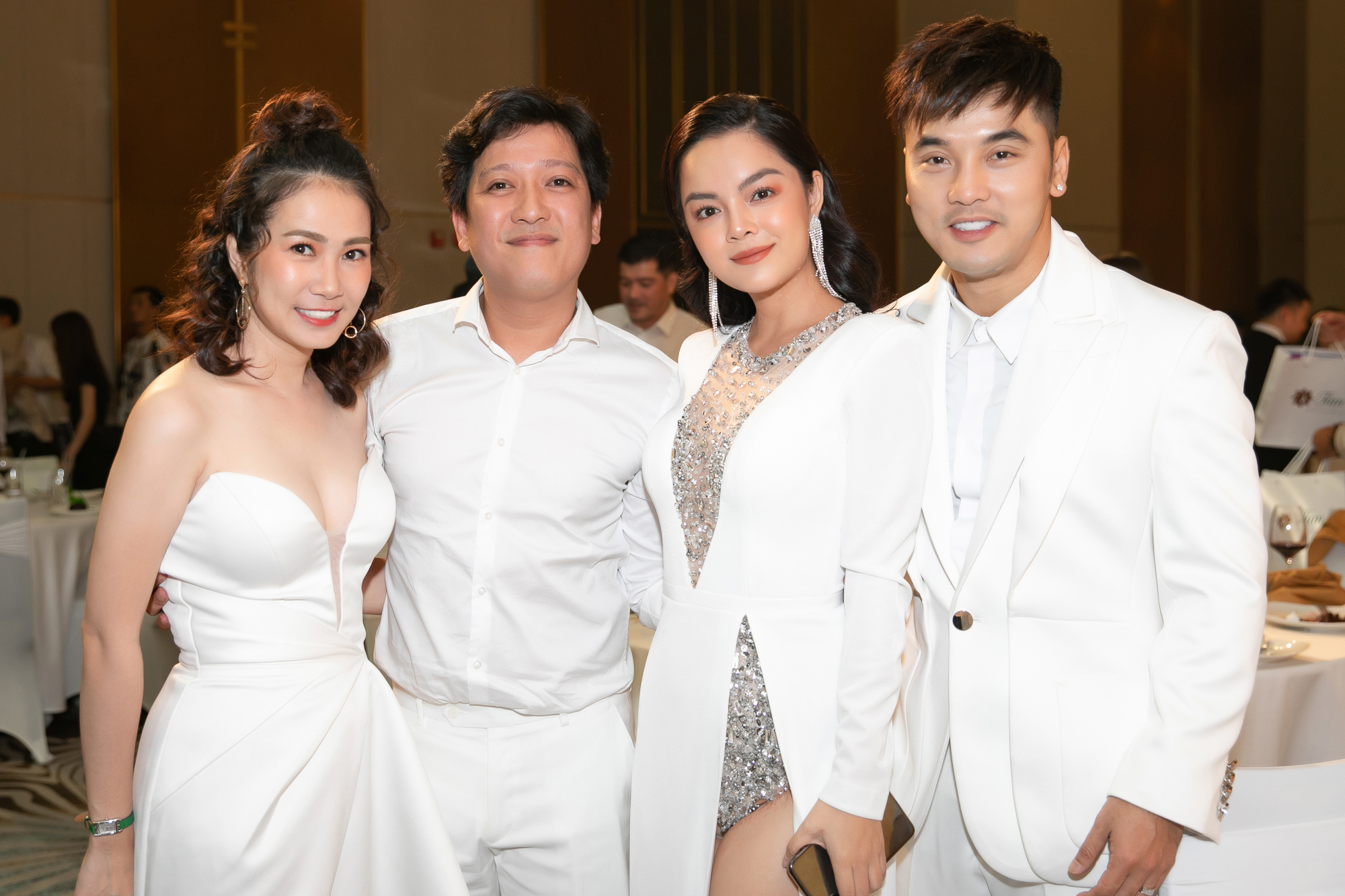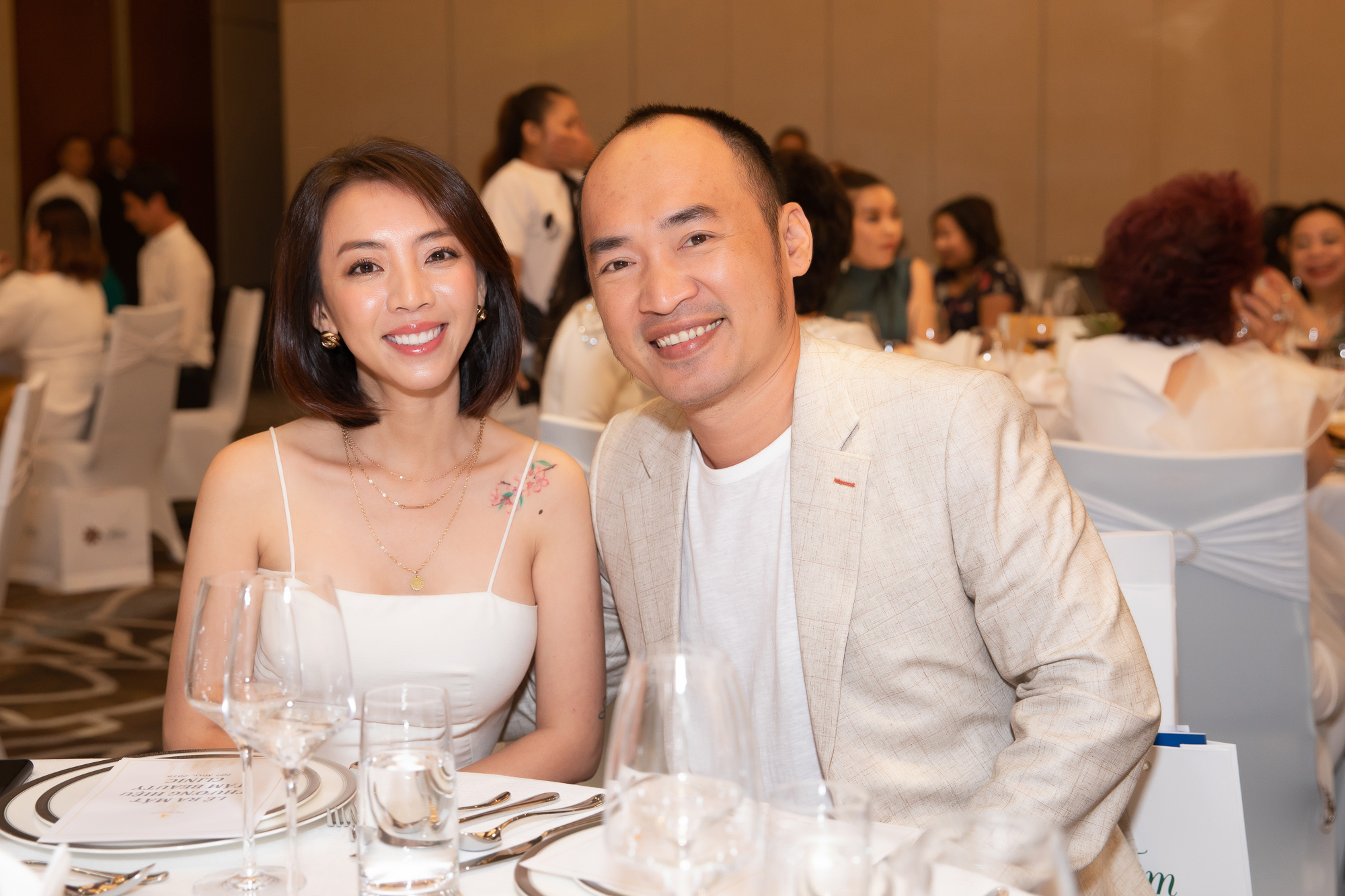 Tại sự kiện, Nhã Phương diện chiếc đầm màu trắng ôm sát khoe đường cong cơ thể đồng thời để lộ phần vai trần quyến rũ, bên cạnh cô là ông xã Trường Giang giản dị với áo sơ mi trắng. “Mười Khó” luôn theo sát bà xã để làm chỗ dựa tinh thần vững chắc, đồng thời không ngần ngại thể hiện tình cảm khiến những vị khách có mặt không khỏi ngưỡng mộ.