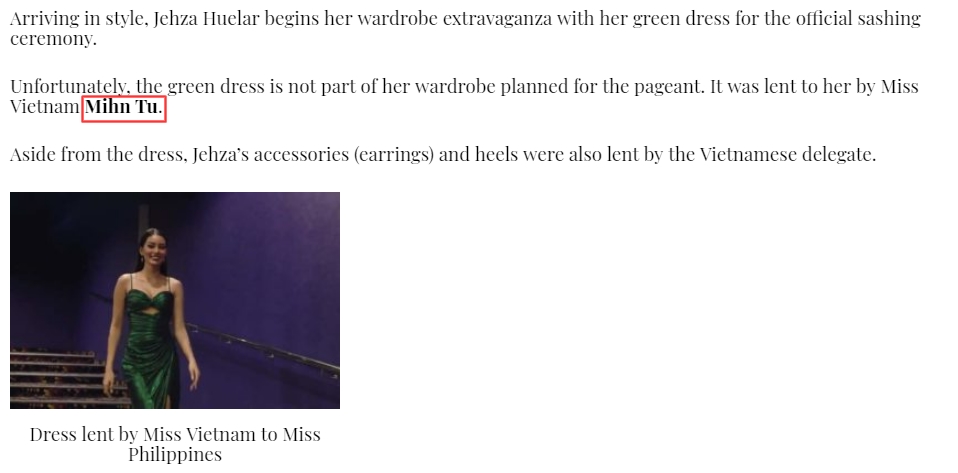 Sau khi giới thiệu thí sinh nước nhà diện trang phục màu xanh lá trong buổi nhận sash của Miss Supranational 2018, trang theqrown cung cấp thông tin cụ thể: “Thật không may, chiếc váy màu xanh lá cây này không phải là trang phục mà Jehza mang đến cuộc thi. Nó được Miss Vietnam Mihn Tu cho mượn. Ngoài trang phục, phụ kiện của Jehza là bông tai và giày cao gót cũng được đại diện Việt Nam cho mượn“.
