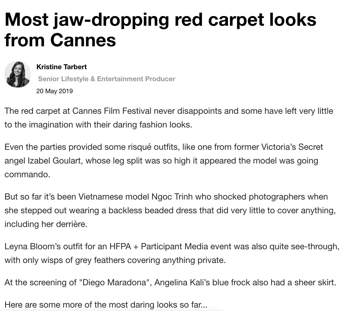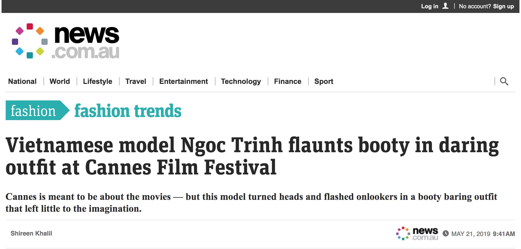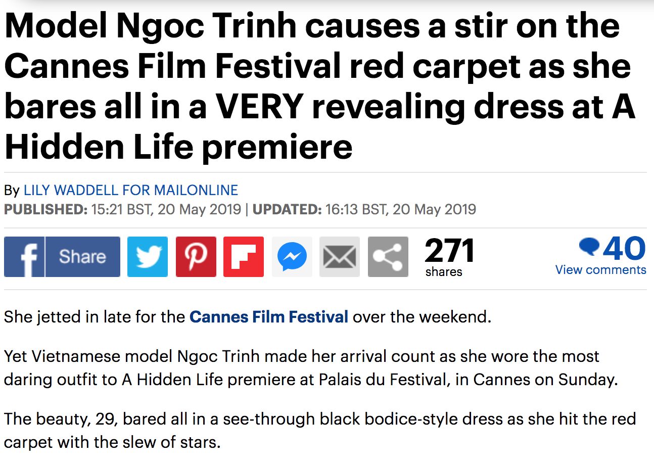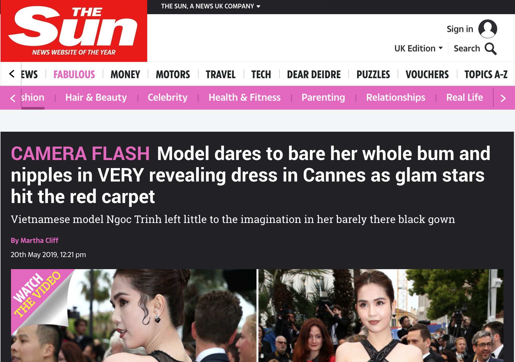 Theo đó, tờ báo thông tin rằng: “Người mẫu Ngọc Trinh lôi kéo mọi ánh mắt đổ dồn về cô tại Liên hoan phim Cannes 2019 tối qua. Nữ diễn viên 29 tuổi đến từ Việt Nam đã mặc một bộ trang phục vô cùng hở hang để xuất hiện trên thảm đỏ tại sự kiện điện ảnh thường niên lần thứ 72”.