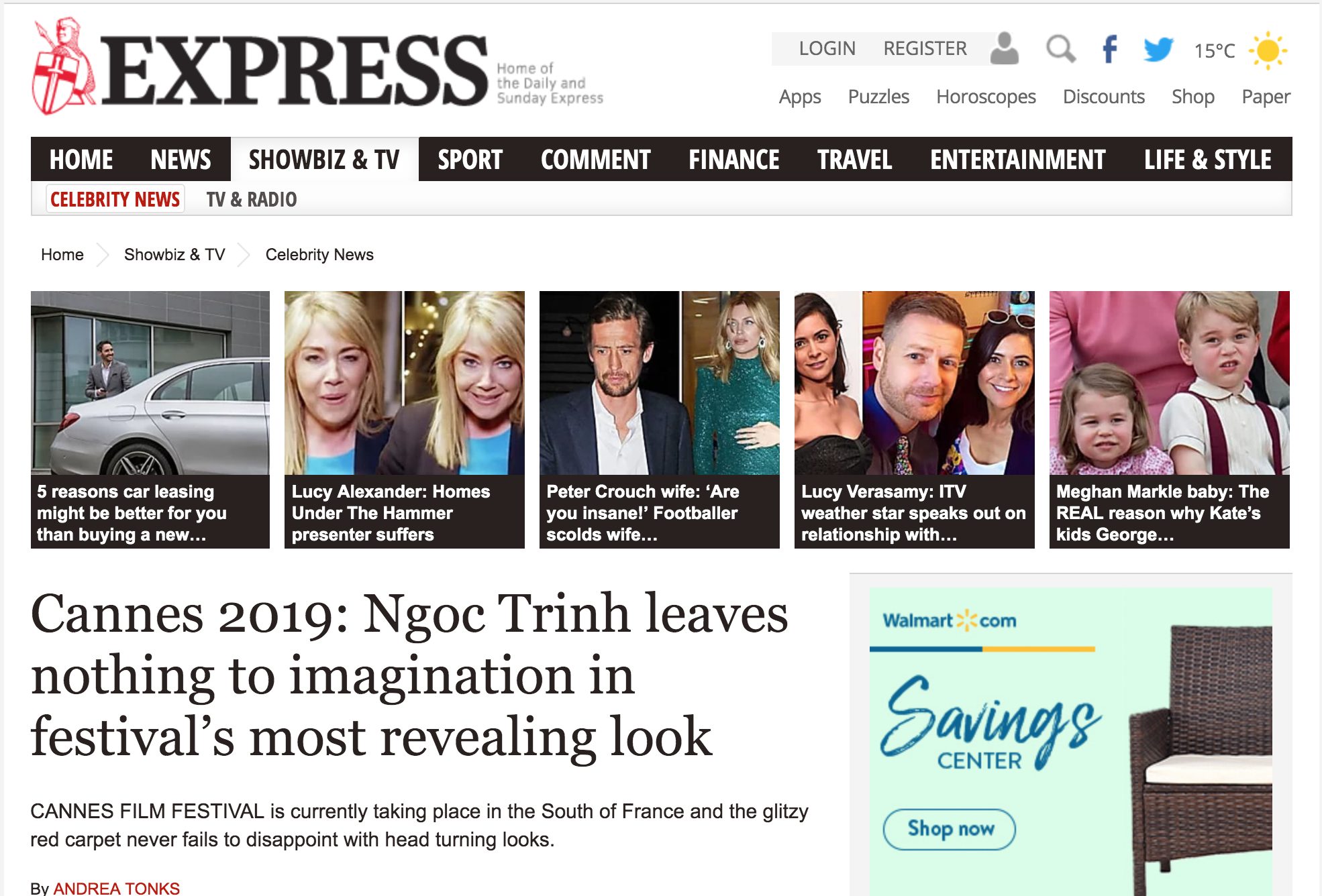 Một tờ báo khác của Anh có tên Express cũng bình luận về sự xuất hiện của “nữ hoàng nội y”: “Cannes 2019 - Ngọc Trinh không để lại gì ngoài trí tưởng tượng tại sự kiện nổi tiếng này”.
