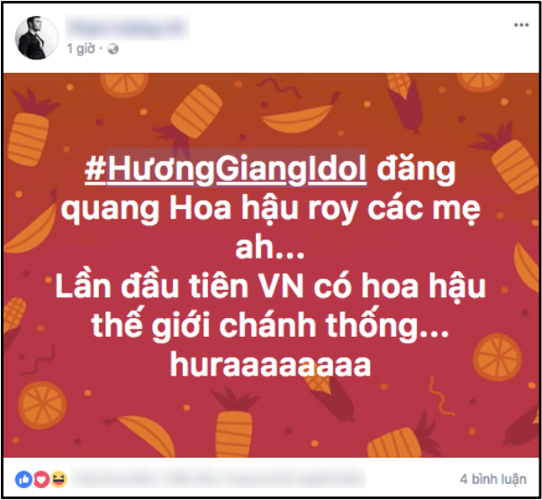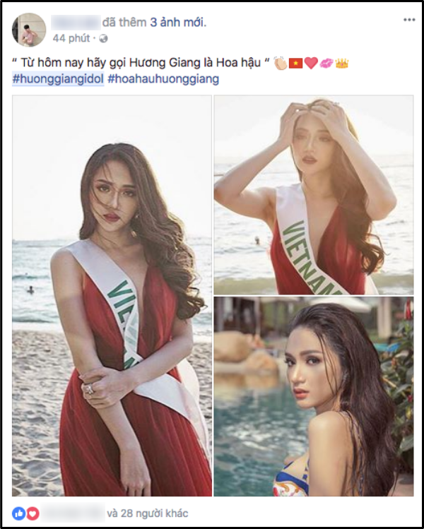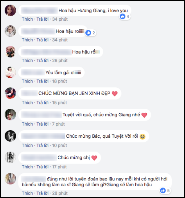 Sau khi có kết quả, người hâm mộ nước nhà không giấu nổi niềm vui và sự phấn khích. Trên khắp các trang mạng xã hội, tràn ngập những lời chúc của công chúng gửi đến Hương Giang. Trong đó, “Từ hôm nay, hãy gọi Hương Giang là Hoa hậu” trở thành câu nói viral ấn tượng nhất trên khắp các “mặt trận” đêm qua.