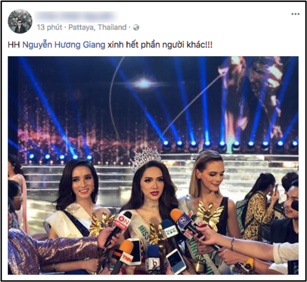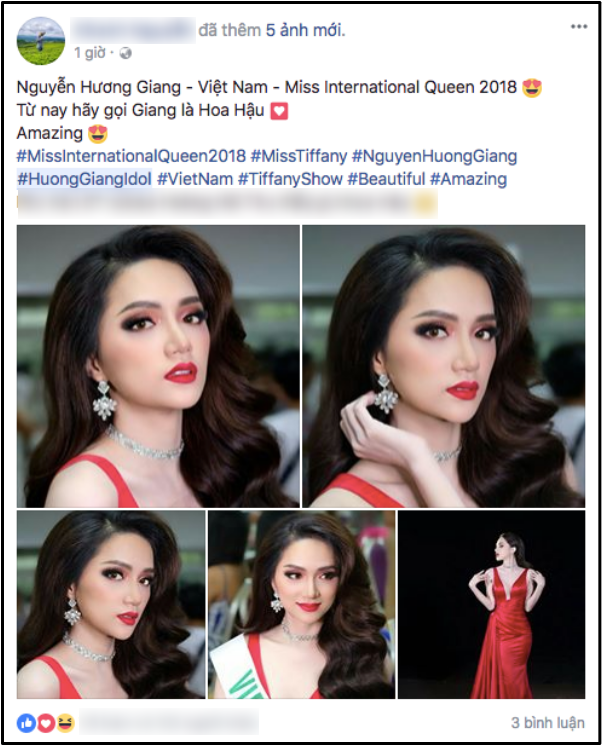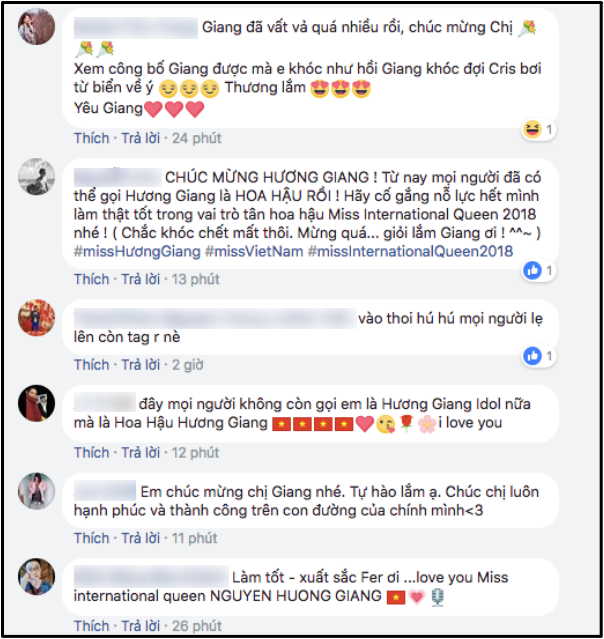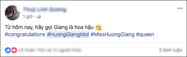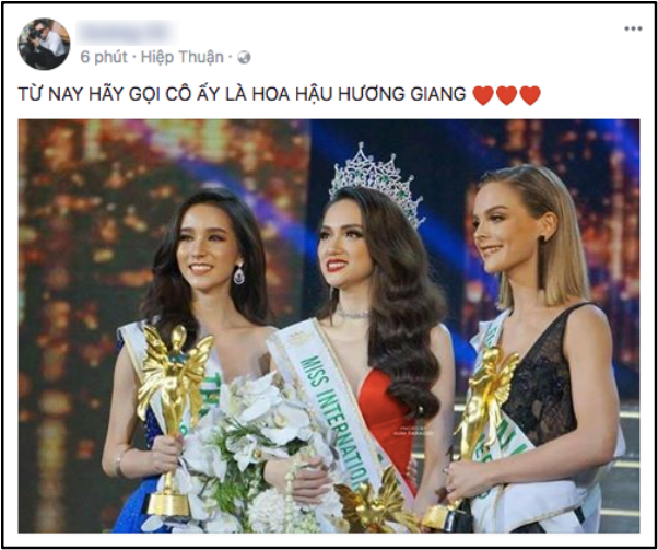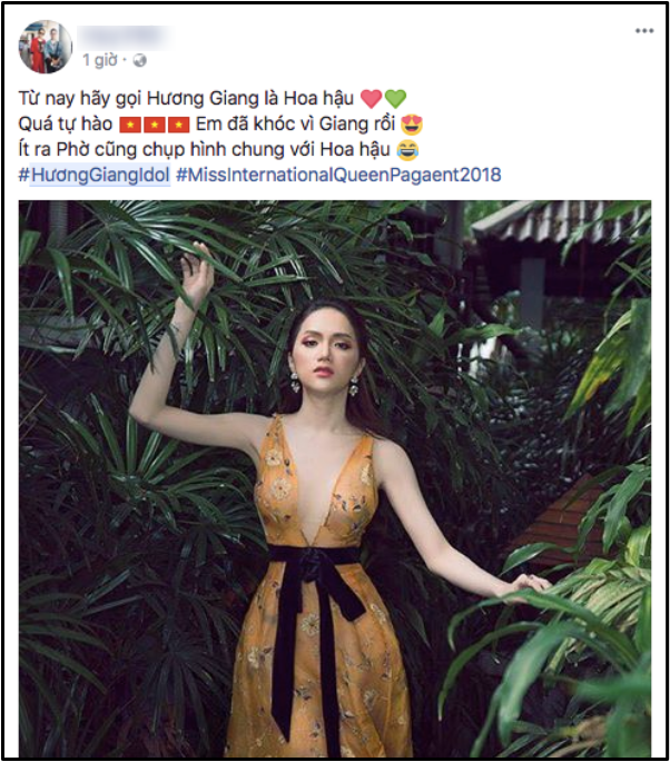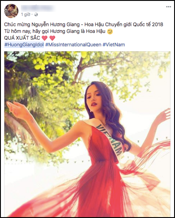 Chúc mừng Hương Giang đã đạt xuất sắc đăng quang tại cuộc thi Hoa hậu Chuyển giới Quốc tế 2018, mang về vinh quang, niềm tự hào cho nước nhà! Và nhớ, từ nay hãy gọi Hương Giang là Hoa hậu!
