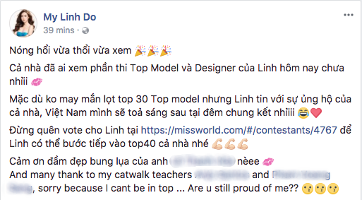 Đỗ Mỹ Linh xin lỗi vì không lọt top 30 và mong khán giả vẫn tiếp tục bình chọn để cô có thể bước vào top 40.