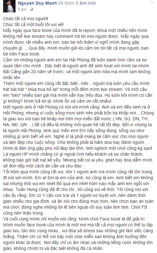Sáng 25/2, Duy Mạnh đã đăng tải một dòng trạng thái khá dài trên mạng xã hội, thông báo Tuấn Hưng đã gọi điện cho mình để hóa giải mâu thuẫn. Ngay khi vừa đăng tải, chia sẻ của Duy Mạnh đã lập tức thu hút đông đảo sự chú ý của cư dân mạng. Anh cho biết do tài khoản Facebook cá nhân bị khóa nên không thể thông báo với người hâm mộ sớm hơn. Qua đó, Duy Mạnh cũng gửi lời cảm ơn bạn bè và fan vì đã luôn quan tâm và hỏi thăm trong suốt thời gian qua.