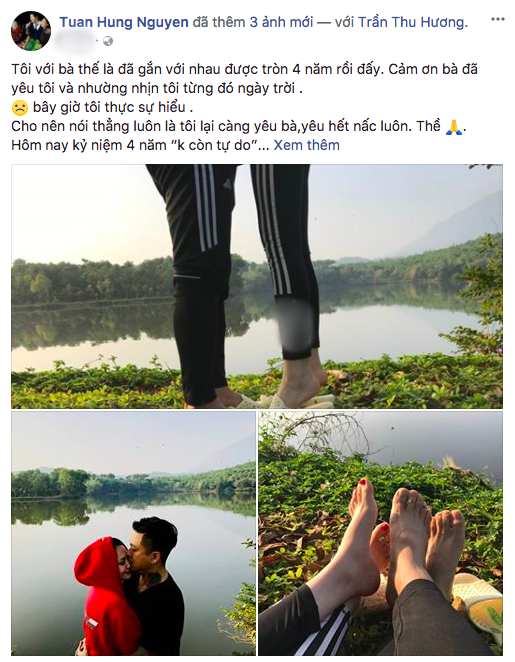 Giọng ca Nắm lấy tay anh ngọt ngào chia sẻ: “Tôi với bà thế là đã gắn với nhau được tròn 4 năm rồi đấy. Cảm ơn bà đã yêu tôi và nhường nhịn tôi từng đó ngày trời. Bây giờ tôi thực sự hiểu. Cho nên nói thẳng luôn là tôi lại càng yêu bà, yêu hết nấc luôn. Thề. Hôm nay kỷ niệm 4 năm 'không còn tự do'. Tôi hứa với bà là sẽ luôn là người chồng tốt và bố tuyệt vời nhất có thể. Tôi yêu bà. Thế thôi”.