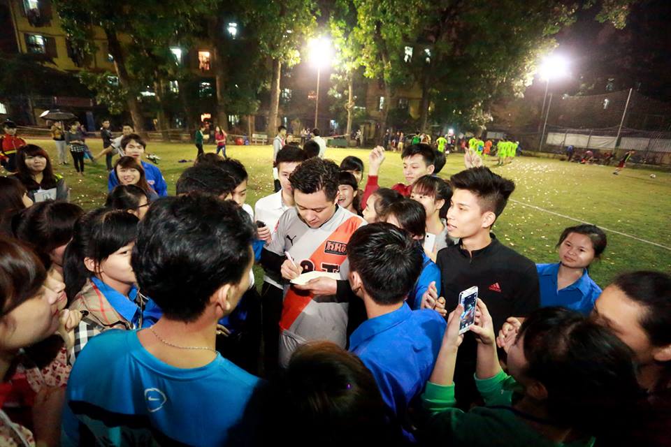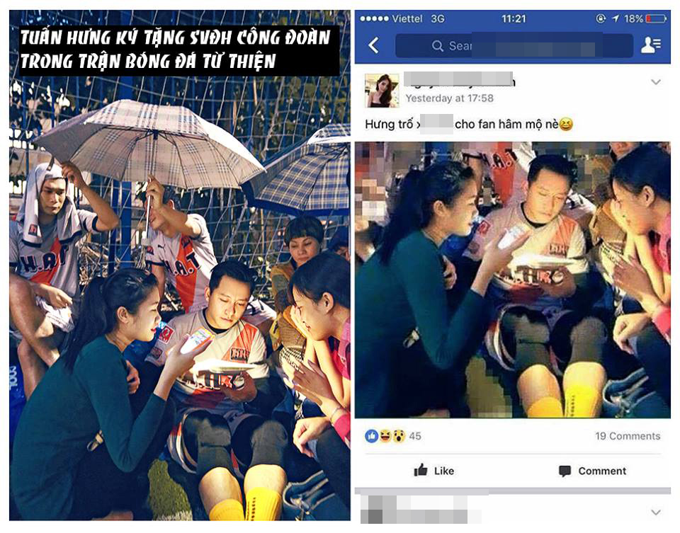 Ps: Tấm ảnh chụp chung với các bạn sinh viên Đại học Công Đoàn cách đây 2 năm, khi mình đang cầm vở để ký tặng cho các bạn thì bị photoshop thành cái đĩa. Thủ đoạn khá đê tiện và dã man. Sau 1 đêm ngủ dậy điện thoại hết sạch pin vì bị số lạ làm phiền..” - Tuấn Hưng viết.
