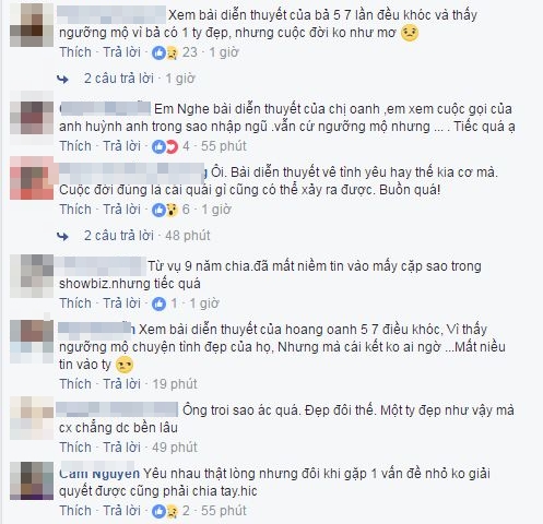 Hiện tại, trên các trang mạng xã hội, phần đông khán giả thể hiện sự tiếc nuối trước thông tin “sốc” này. Đặc biệt, không ít fan chia sẻ lại bài diễn thuyết cực hay và xúc động của Hoàng Oanh tâm sự về tình yêu của mình - khoảnh khắc mà cô từng lay động hàng triệu trái tim người xem truyền hình khi tham gia một show thực tế.