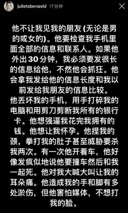 Trong bài viết, Julieta còn nhắc đến Tưởng Kình Phu với nhiều pha bạo lực khác nhau, tiêu hết tiền của cô còn ép cô mang thai, đánh vào bụng cô, thậm chí uy hiếp sẽ giết cô ấy. Ngoài ra, Tưởng Kình còn chửi mắng, đòi đánh cả cha mẹ anh ta.