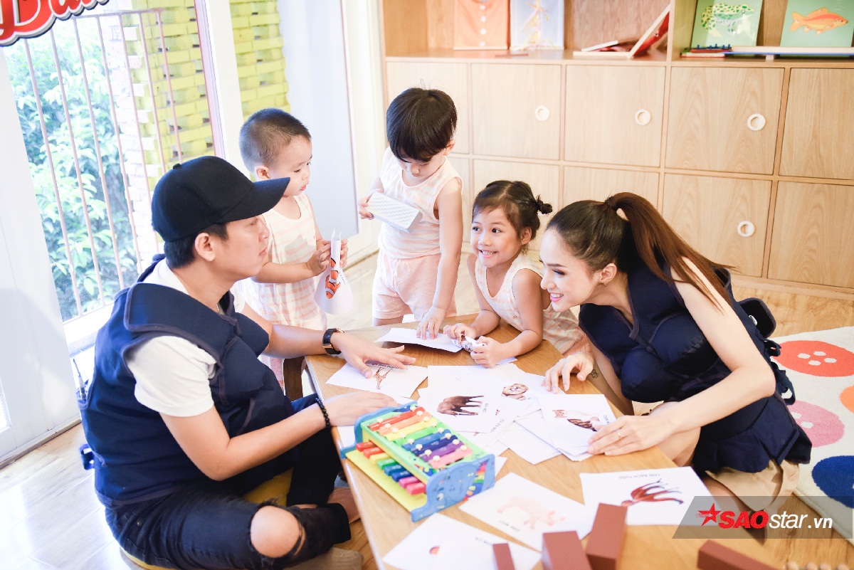 Có ai đáng yêu như Hương Giang, nằm lăn ra sàn nhà chơi đùa cùng trẻ.