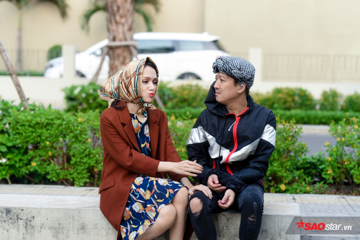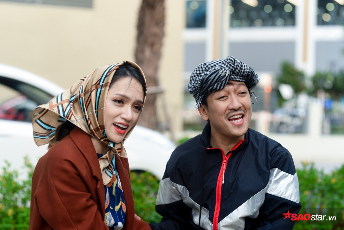 Việc thường xuyên sắm vai diễn người già khiến Trường Giang có thừa kỹ năng trang điểm cho bạn đồng hành Hương Giang. Chỉ với vài đường cọ đơn giản, cô nàng đang là đương kim Hoa hậu Chuyển giới Quốc tế bỗng trở thành… bà ngoại vô cùng xứng đôi với “Mười Khó”.