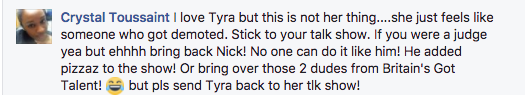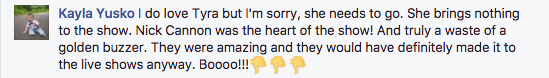 Một khán giả khác lại thật sự giận dữ khi thấy Tyra mặc bộ đồ đen gợi cảm đến nỗi nhìn được đồ lót bên trong, không phù hợp với một show giải trí dành cho cả gia đình đều xem như AGT
