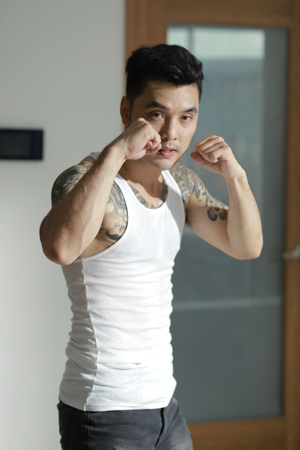 Ưng Hoàng Phúc mướt mồ hôi trên sàn tập võ.