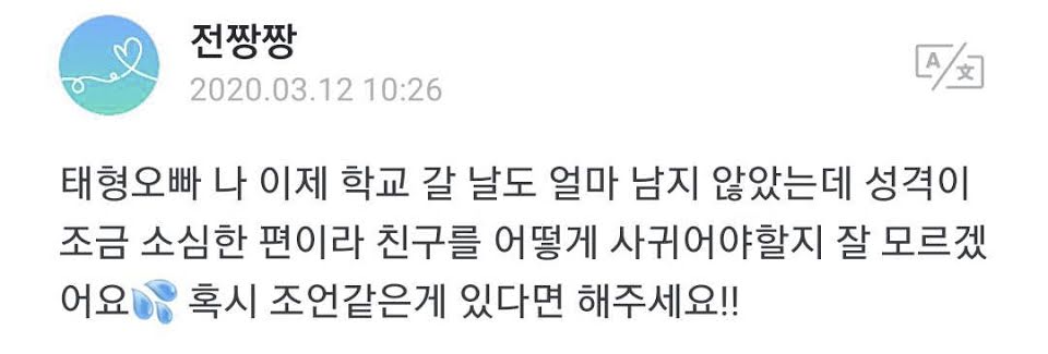 Mới đây, 1 Army (tên gọi fandom BTS) đã hỏi V về bí quyết giúp kết bạn ở trường. Cụ thể, fan nữ chia sẻ: “Anh Taehyung à, em chỉ còn vài ngày nữa là đến trường rồi. Em là một người nhút nhát, vì vậy em không biết làm thế nào để kết bạn. Xin hãy cho em một lời khuyên với!”.