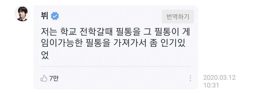Với tính cách vui vẻ cùng hộp bút chì vui nhộn, có lẽ V đã thành công chiếm được cảm tình của mọi người trong ngày đầu tiên gặp gỡ tại trường. Trước đó vào năm 2019, anh chàng đã từng khiến fan ngạc nhiên khi chia sẻ về bí quyết giúp mình sống sót khỏi một lần bị bạn bè bắt nạt.
