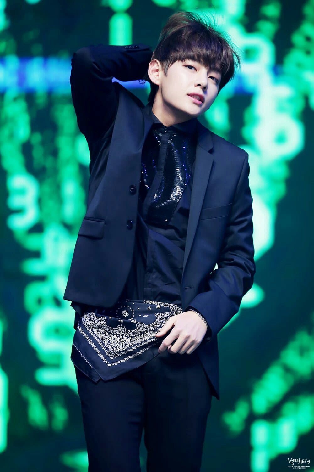 Phong cách bad boy với áo khoác bomber và băng đeo trán khi biểu diễn.