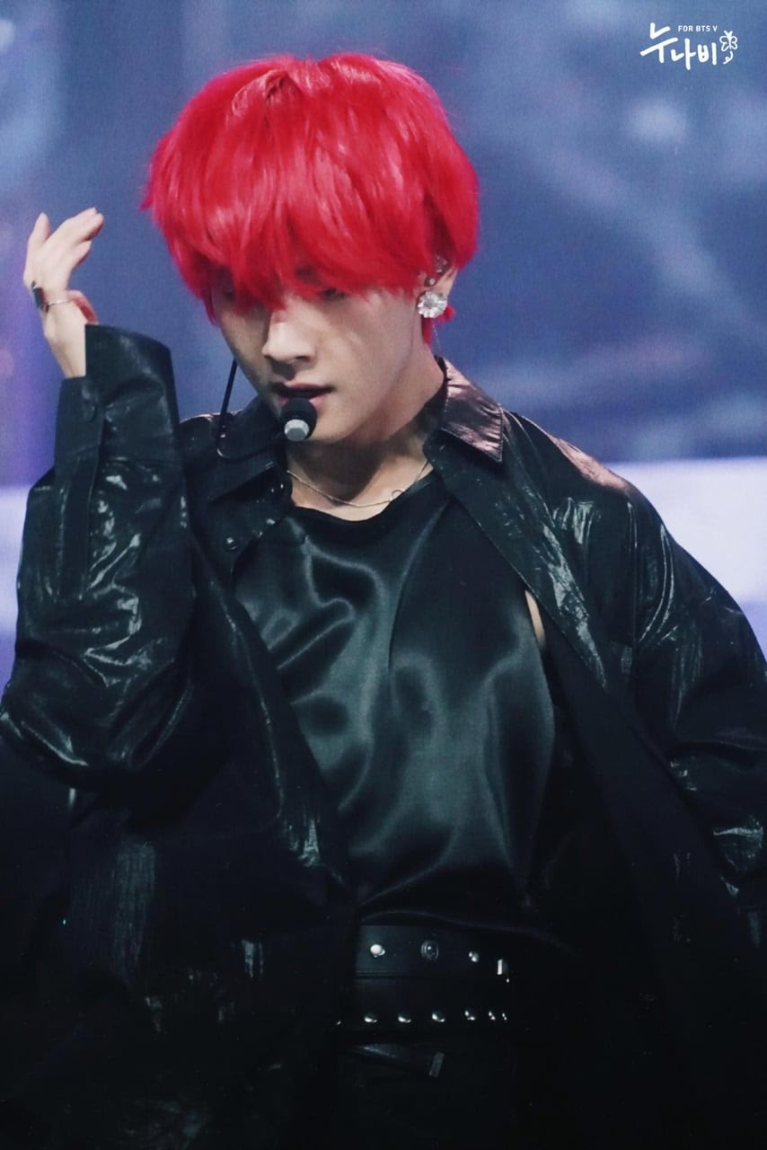 Với bộ trang phục đen cùng kẻ mắt đậm, nhìn V tựa như chàng “trai hư” học đường.