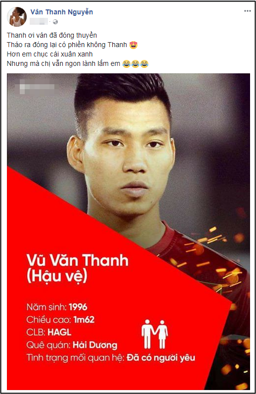 Trên trang cá nhân, nữ nghệ sĩ sinh năm 1985 hóm hỉnh chia sẻ bài thơ ngắn do chính mình sáng tác dành tặng tuyển thủ U23, “Thanh ơi ván đã đóng thuyền/ Tháo ra đóng lại có phiền không Thanh/ Hơn em chục cái xuân xanh/ Nhưng mà chị vẫn ngon lành lắm em”.