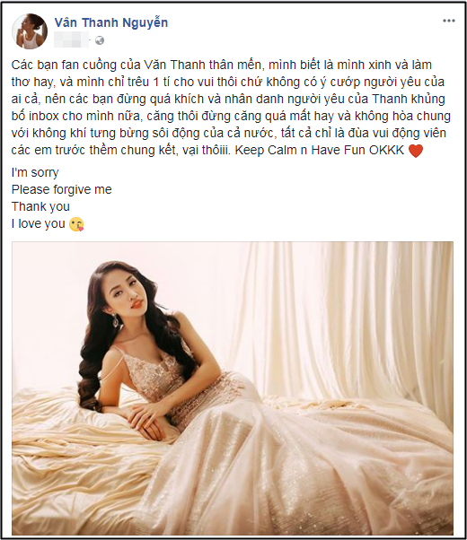 “Các bạn fan cuồng của Văn Thanh thân mến, mình biết là mình xinh và làm thơ hay, và mình chỉ trêu một tí cho vui thôi chứ không có ý cướp người yêu của ai cả, nên các bạn đừng quá khích và nhân danh người yêu của Thanh khủng bố tin nhắn cho mình nữa.