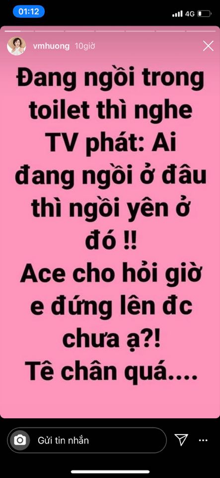 Cụ thể, trên trang cá nhân, giọng ca Ngày chung đôi viết: “Đang ngồi trong toilet thì nghe TV phát: Ai đang ngồi ở đâu thì ngồi yên ở đó. Anh chị em hỏi giờ em đứng lên được chưa ạ? Tê chân quá…”.