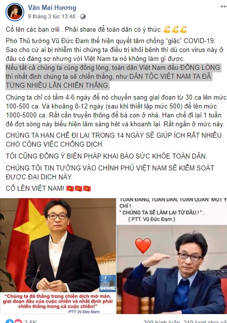 Trước diễn biến phức tạp của dịch Covid-19 ở nhiều nước trên thế giới và Việt Nam, trong khi những nghệ sĩ đang thể hiện hành động đẹp vì nước, thì Văn Mai Hương lại là 1 trong những nữ ca sĩ hiếm hoi bị ném đá vì phát ngôn của mình liên quan đến mùa dịch bệnh này.
