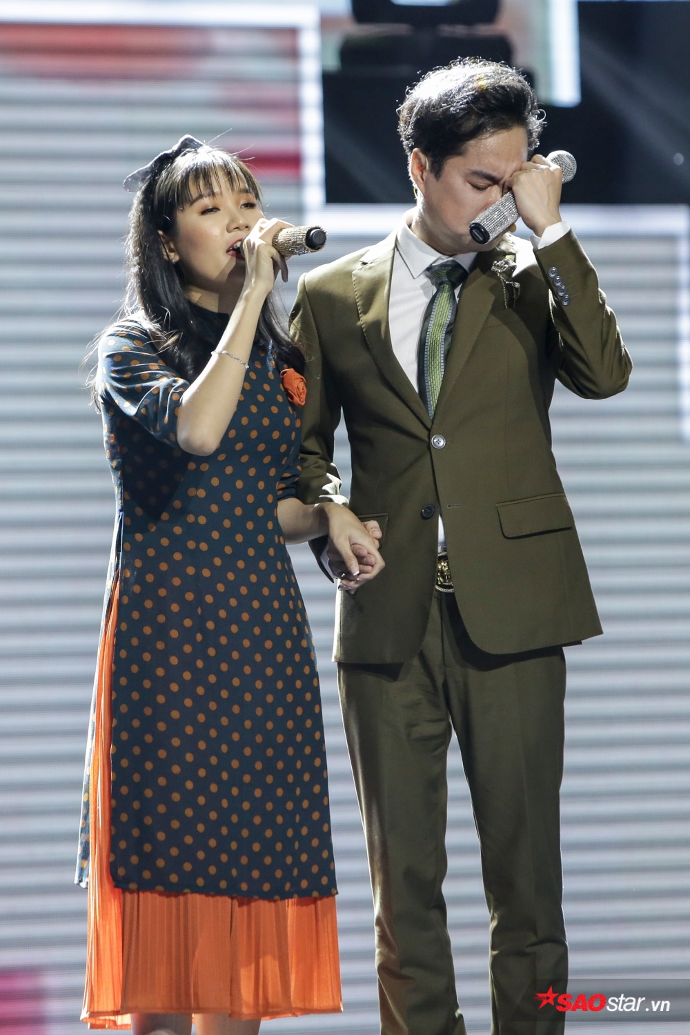- Lúc đang hát thầy Sơn có lay lay tay ra hiệu cho em hát. Đó là dấu hiệu cho biết song ca. Lúc em nâng micro lên em nghe tiếng nấc. Em quay qua cảm giác bóng tay lau nước mắt, lúc đó mình thấy xúc động vì tình cảm của thầy. Thầy đã khóc vì mình. Khoảnh khắc đó không bao giờ trong đời em quên được.