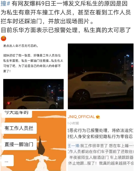 Mới đây, blogger tiết lộ lý do tại sao Vương Nhất Bác lại tức giận như vậy. Nguyên nhân quan trọng không phải anh bị làm phiền mà là Sasaeng fan trong quá trình theo dõi bị phát hiện, nhân viên Vương Nhất Bác xuống xe cản lại, có lòng tốt khuyên họ không nên tiếp tục theo đuôi nữa. Nhưng phía Vương Nhất Bác không ngờ đến việc đối phương lại trực tiếp lái xe tông vào người nhân viên công tác.
