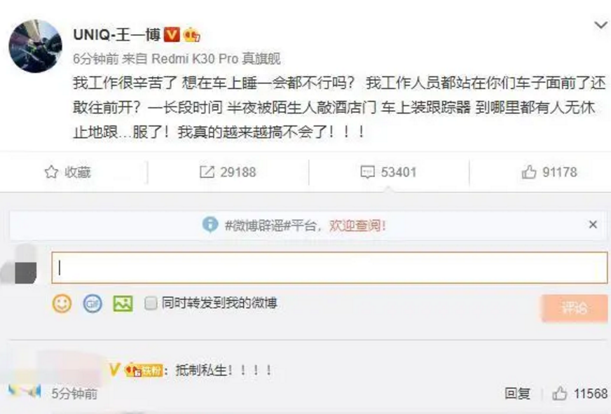 Tối ngày 9 tháng 5, Vương Nhất Bác - nam minh tinh đỉnh cấp lưu lượng (vô cùng hot) trong giới giải trí đăng bài viết tỏ ra bất mãn, tức giận với hành vi của fan cuồng. Anh bày tỏ vốn dĩ công việc đã đủ vất vả rồi, chỉ muốn trên xe nghỉ ngơi một chút nhưng không ngờ gặp phải Sasaeng fan (fan cuồng) theo sát. Nửa đêm, nam diễn viên còn bị người lạ gõ cửa khách sạn, thậm chí trên xe còn có thiết bị theo dõi, bị người khác bám đuôi không ngừng.
