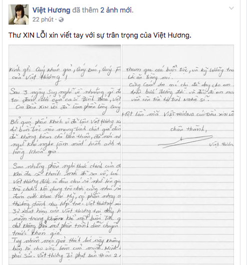 Về phía mình, sau khi im lặng một thời gian, diễn viên Việt Hương quyết định lên tiếng về sự cố. Thay vì đăng tải “status” như mọi khi, Việt Hương đã viết thư tay xin lỗi khán giả. Theo đó, nữ danh hài cho biết do mình quá phấn khích vì lâu rồi mới đi dự đám cưới có tính chất gia đình nên đã không kiểm soát bản thân, nói những từ khó nghe gây ảnh hưởng tới hình ảnh trong mắt khán giả.