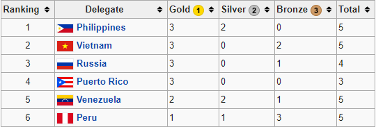 Cùng cân bằng tổng số huy chương với Philippines (3 HCV, 2 HCB), Peru (1 HCV, 1 HCB, 3 HCĐ), Venezuela (2 HCV, 2 HCB, 1 HCĐ) đại diện Việt Nam được đặt cược vào Top 5, thậm chí còn làm rung chuyển BXH với ngôi vị hoa hậu.