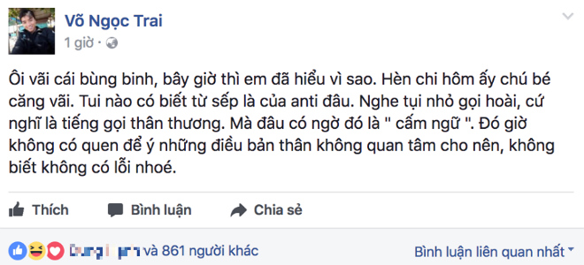 Mới đây, Ngọc Trai chính thức lên tiếng sau sự cố gọi Sơn Tùng M-TP là “Sếp” trong buổi họp báo ra mắt phim ngắn. Nam VJ đính chính do nghe nhiều gọi Sơn Tùng thế nên nghĩ đấy là tên gọi thân thương. Cuối cùng, Ngọc Trai cho rằng do bản thân không quan tâm đến vấn đề này nên… không biết không có lỗi.