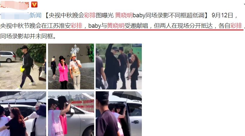 Trước đó, hình ảnh buổi tập cho Đêm hội Trung thu của CCTV được tiết lộ. Huỳnh Hiểu Minh - Angelababy mạnh ai nấy đi, hai người một trước một sau bước vào nơi tập. Mỗi người tự tập tiết mục của mình, cùng ghi hình ở một nơi nhưng vẫn không xuất hiện cùng nhau. Lúc đó, Huỳnh Hiểu Minh và nữ trợ lý cùng nhau xuống máy bay, trong khi nam tài tử xách túi lớn túi nhỏ thì nữ trợ lý bên cạnh luôn gọi điện thoại.