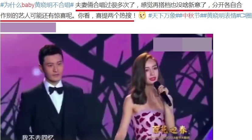 Chiếu theo lẽ thông thường, nếu như Huỳnh Hiểu Minh cùng vợ Angelababy song ca bài hát Chỉ nguyện người dài lâu thì làm gì có cớ sự phát sinh tin đồn. Sau đó, blogger tiết lộ trong quá trình phỏng vấn sau sân khấu, hai người lại chia rời phỏng vấn riêng, còn những cặp vợ chồng khác thì đi đôi đi cặp. Từ khóa “Tại sao Huỳnh Hiểu Minh và Angelababy không hát chung” cũng xuất hiện trên hot-search weibo, tiếp tục dấy lên nghi vấn về vấn đề tình cảm giữa hai người họ.