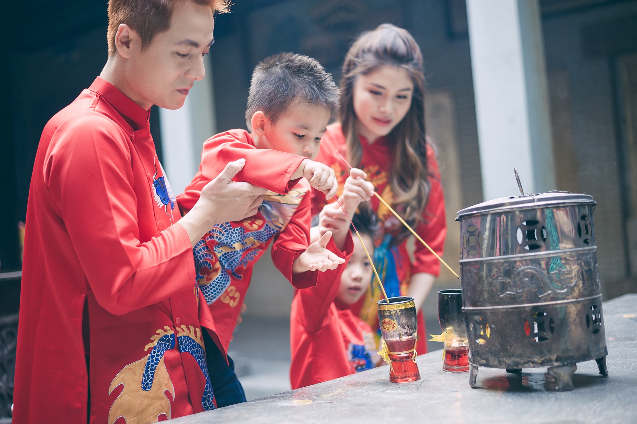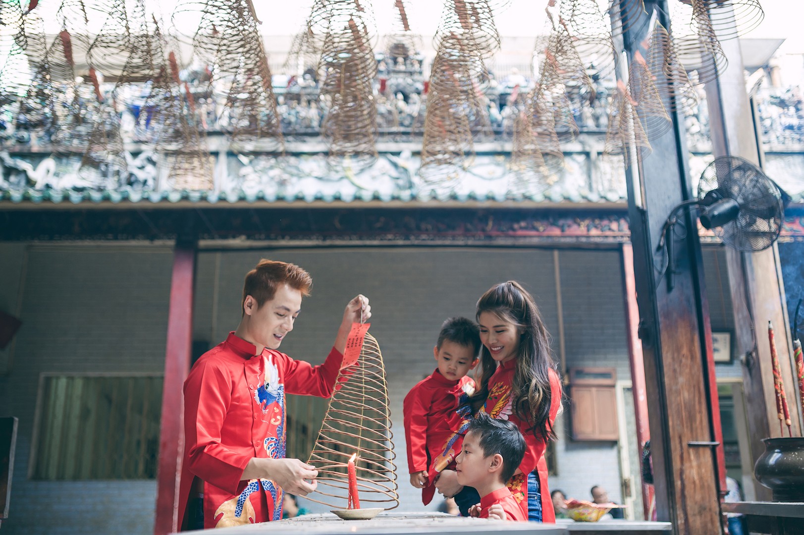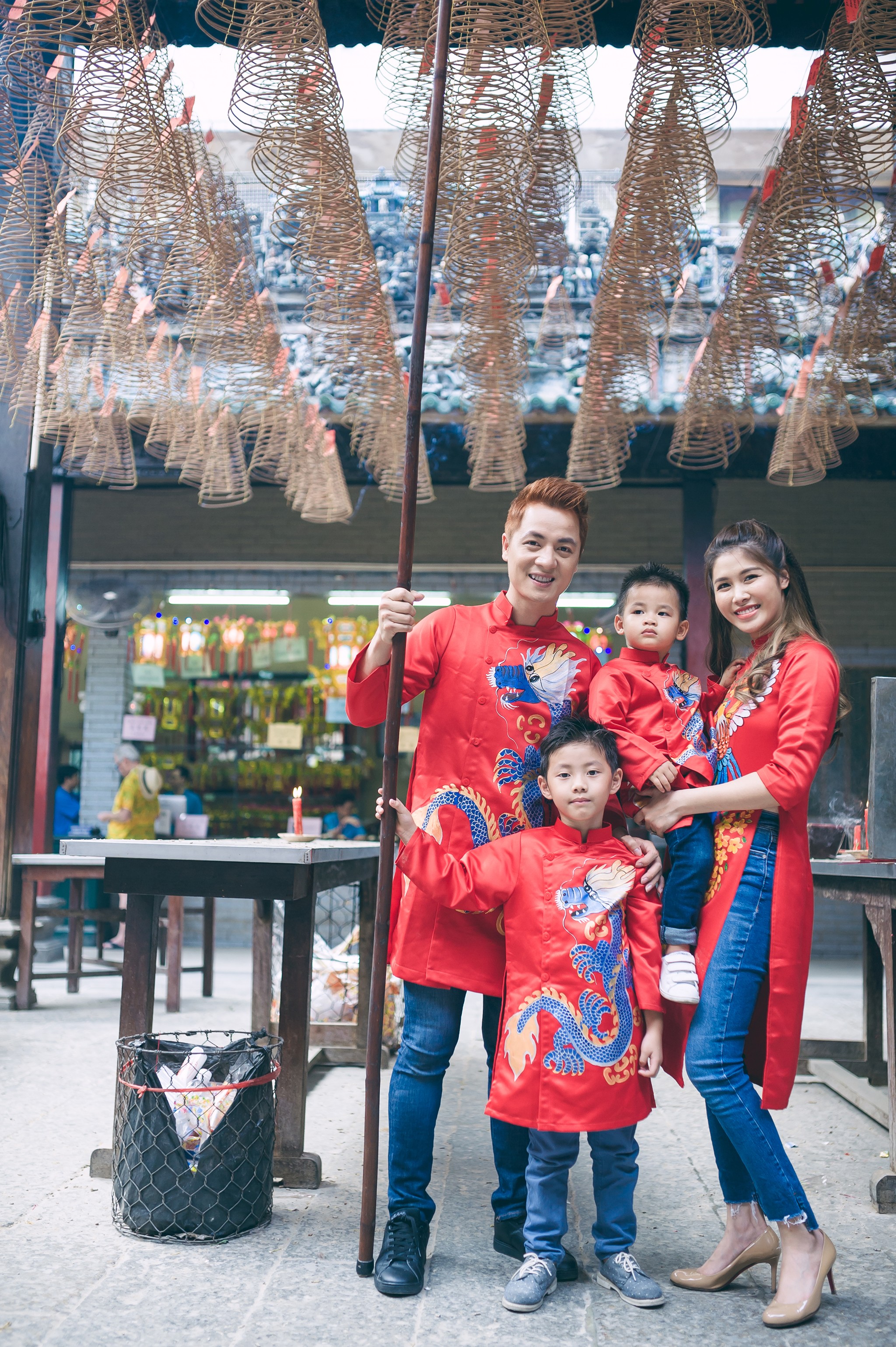 Dù lịch trình khá bận rộn thế nhưng, Đăng Khôi và Thủy Anh vẫn thống nhất gác lại bộn bề công việc và dành trọn những ngày đầu năm cho mái ấm nhỏ. Gia đình nam ca sĩ Chiếc lá tình yêu lựa chọn áo dài truyền thống, ton-sur-ton đỏ để lấy may mắn và đến một ngôi chùa cầu bình an.