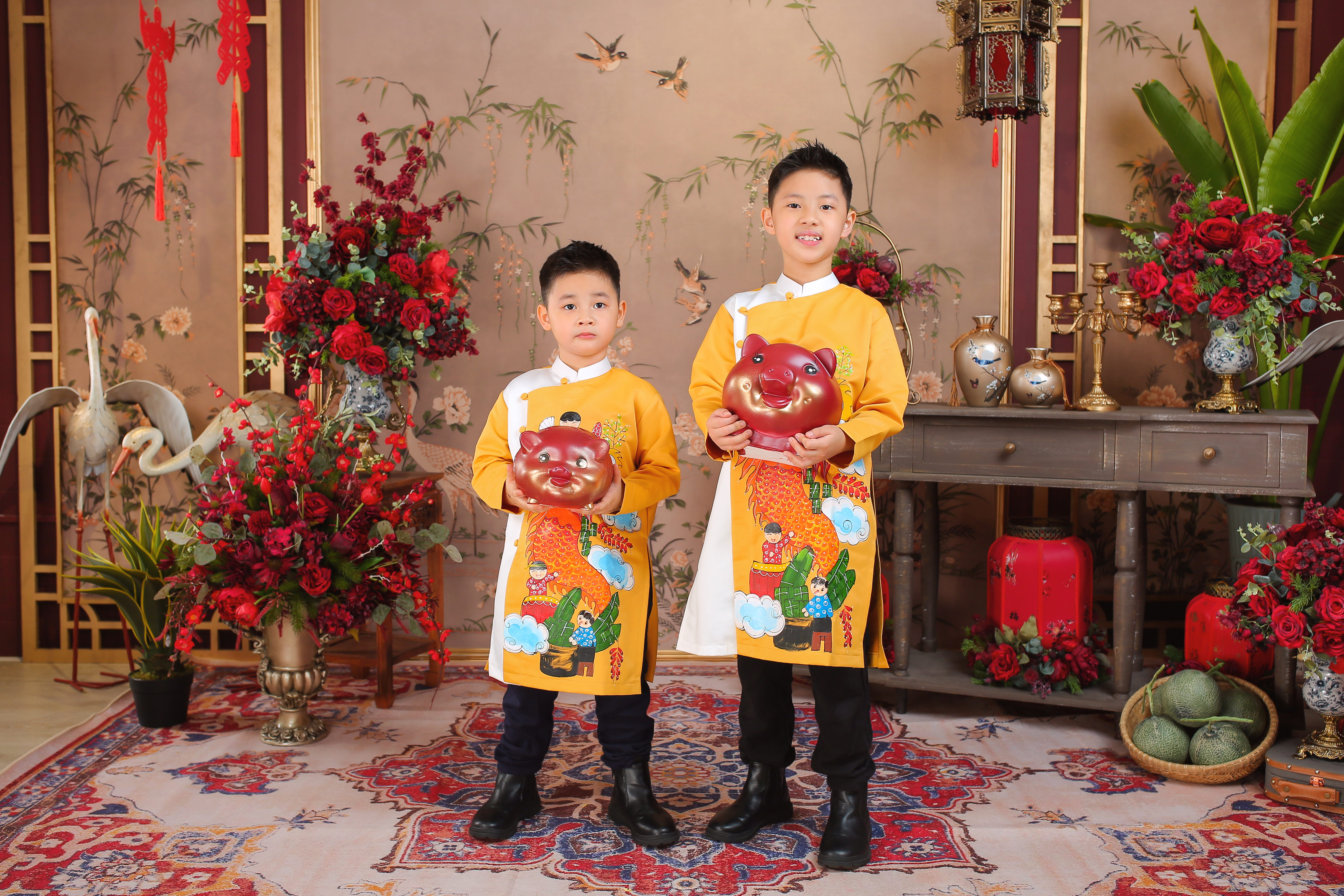 Năm nay, bé Đăng Khang - cậu cả nhà Đăng Khôi trông cũng phong độ hơn hẳn, khiến nhiều fan của gia đình Đăng Khôi - Thủy Anh không khỏi ngạc nhiên. Chọn 2 tông màu chính là vàng cam và xanh, gia đình Thủy Anh nổi bật trong khung cảnh Tết xưa đậm nét phương nam.