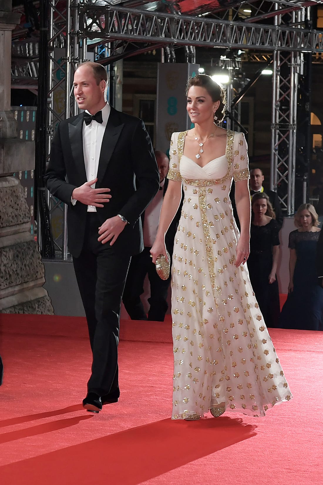 Hoàng tử William và công nương Catherine cũng là một trong số những khách mời đặc biệt tay trong tay xuất hiện trên thảm đỏ sự kiện. Tại đây, nữ công nương xứ Cambridge diện lại một chiếc váy trắng họa tiết vàng khá quen mắt. Được biết, chiếc váy thương hiệu Alexander McQueen đã được cô mặc lần đầu tiên vào năm 2012.