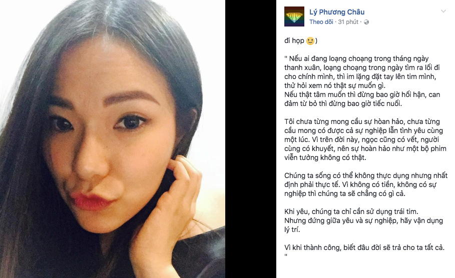 Mới đây, trên trang Facebook cá nhân của mình, vợ cũ Lâm Vinh Hải đã chia sẻ bức ảnh tự sướng khi đang ngồi họp. Dường như tâm trạng cô đã mạnh mẽ hơn và tươi tỉnh trở lại. Đồng thời, Phương Châu cũng đăng tải kèm dòng trang thái khá dài.