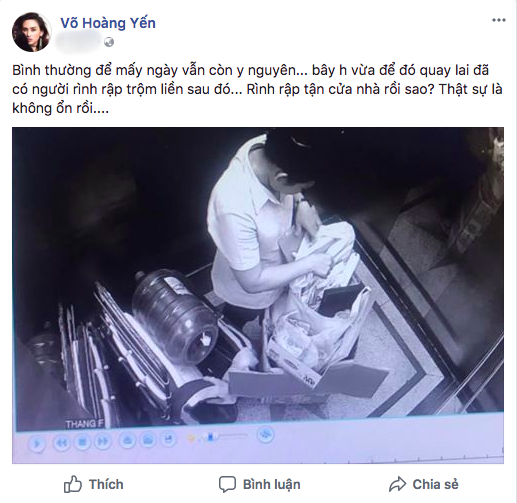 Sau đó ít giờ, Á hậu Hoàn vũ Việt Nam 2018 tiết lộ hình ảnh một người phụ nữ đứng trong thang máy lục đồ rất khả nghi. Nhìn vào camera, Võ Hoàng Yến cho biết: “Bình thường để mấy ngày vẫn còn y nguyên, bây giờ vừa để quay lại đã có người rình rập trộm liền sau đó. Rình rập tận cửa nhà rồi sao? Thật sự là không ổn rồi”.
