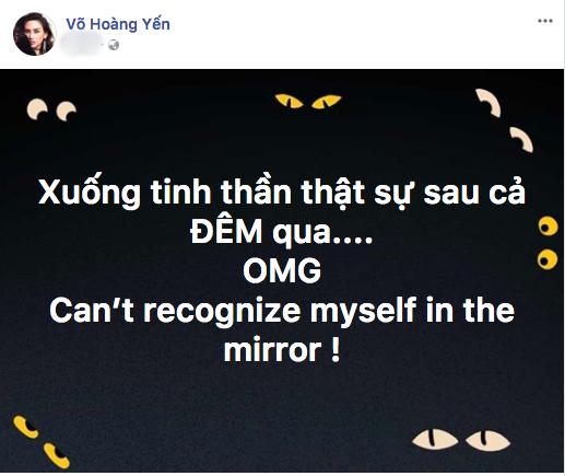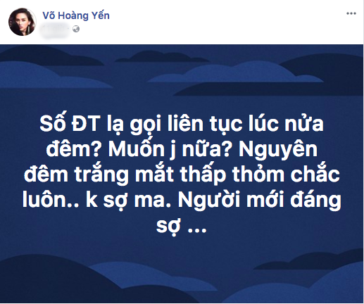Võ Hoàng Yến viết: “Số điện thoại lạ gọi liên tục lúc nửa đêm. Muốn gì nữa? Nguyên đêm trắng mắt thấp thỏm chắc luôn. Không sợ ma. Người mới đáng sợ”. Đến sáng 6/4, người đẹp cho biết đã thật sự xuống tinh thần sau một đêm lo lắng và hoang mang.