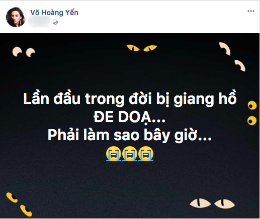 Mới đây, trên trang Facebook cá nhân, Võ Hoàng Yến đăng tải dòng trạng thái lo sợ khi cho biết bị giang hồ đe doạ. Nữ siêu mẫu viết: “Lần đầu trong đời bị giang hồ đe doạ. Phải làm sao bây giờ”.