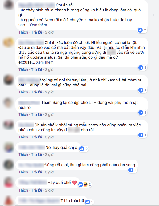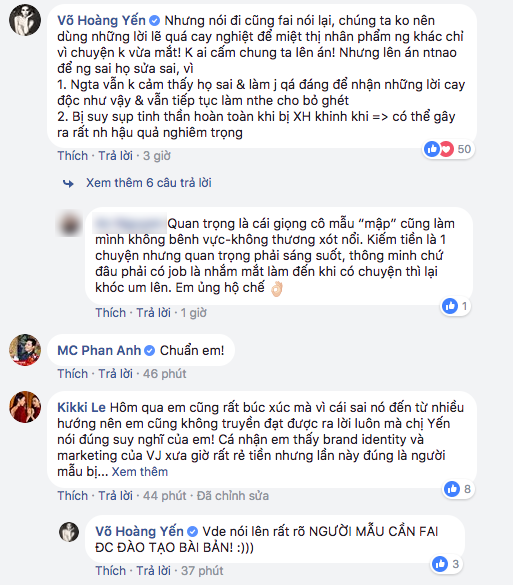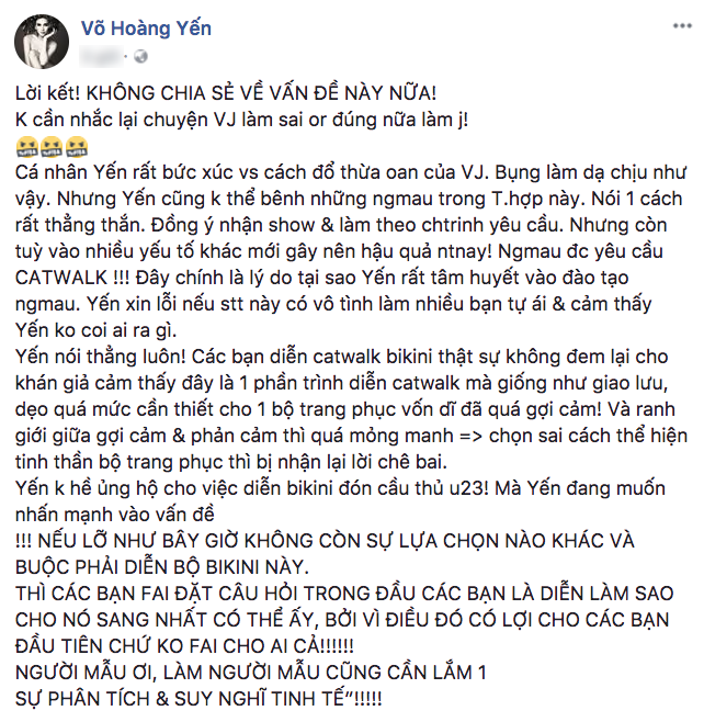 “Nói một cách rất thẳng thắn, đồng ý nhận show và làm theo chương trình yêu cầu nhưng còn tuỳ vào nhiều yếu tố khác mới gây nên hậu quả như thế này. Người mẫu được yêu cầu CATWALK! Đây chính là lý do tại sao Yến rất tâm huyết vào đào tạo người mẫu. Yến xin lỗi nếu status này có vô tình làm nhiều bạn tự ái và cảm thấy Yến không coi ai ra gì” - Võ Hoàng Yến thẳng thắn.