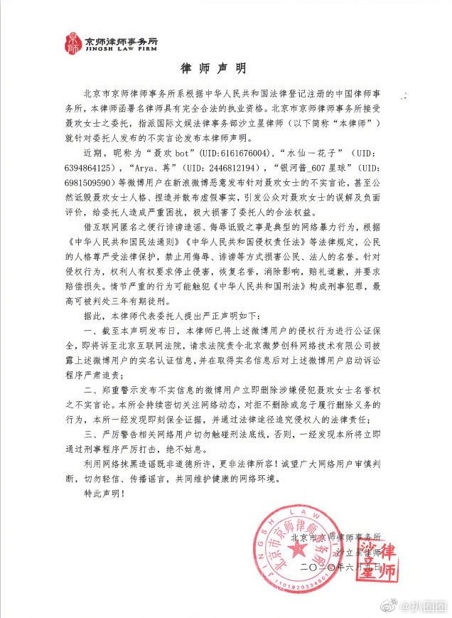 Gần đây, trên mạng xuất hiện những tài khoản đăng tin không đúng sự thật, hủy hoại nhân cách của Nhiếp Hoan – vợ Nhậm Gia Luân. Hôm nay, cô quyết định khởi kiện, phát văn bản của luật sư, yêu cầu những hành vi xâm phạm quyền danh dự phải dừng lại, đồng thời bồi thường tổn thất.