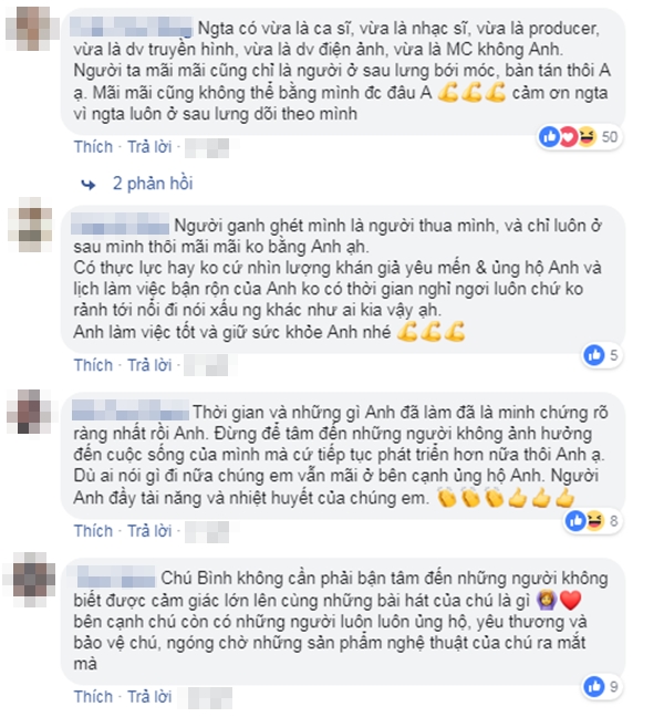 Nhiều cư dân mạng đã bày tỏ thái độ đồng tình với Trịnh Thăng Bình đồng thời khuyên anh chàng không nên quá bận tâm đến những “lời ra tiếng vào” không hay. Với vai trò, ca sĩ, nhạc sĩ, producer và diễn viên, có thể nói trong những năm hoạt động nghệ thuật, anh vẫn luôn là cái tên được khán giả yêu mến cũng như đặt nhiều niềm tin. Dù chưa biết nhân vật được Trịnh Thăng Bình nhắc đến nhưng với tình cảm của mọi người có lẽ nam ca sĩ cũng không còn phải bận tâm đến sự công kích kia.