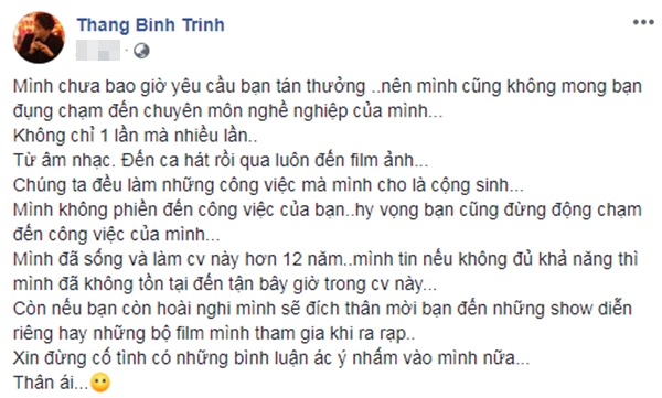 Vừa qua, trên trang cá nhân Trịnh Thăng Bình bất ngờ chia sẻ trên trang cá nhân dòng trạng thái gửi đến một người nào đó vì thái độ khiến anh chàng bất bình. Cụ thể, nam ca sĩ nhắn nhủ: “Mình chưa bao giờ yêu cầu bạn tán thưởng nên mình cũng không mong bạn đụng chạm đến chuyên môn nghề nghiệp của mình. Không chỉ 1 lần mà nhiều lần“.