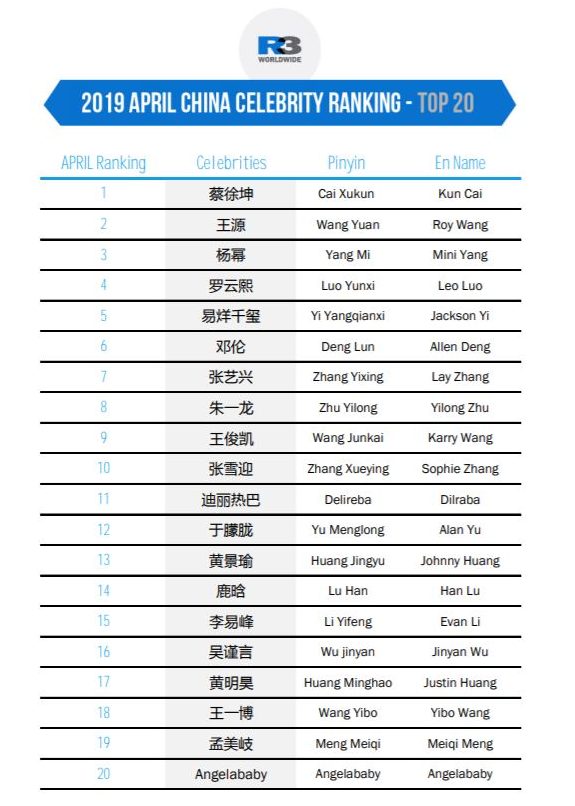Jing Daily x R3 là bảng xếp hạng hàng tháng về những người nổi tiếng có ảnh hưởng nhất trên mạng xã hội trực tuyến tại Trung Quốc, từ Weibo và WeChat đến Toutiao và Baidu. Và với bảng xếp hạng này vào tháng 5 đã cho thấy sự ảnh hưởng của Thái Tử Khôn khi mới đây anh chàng trở thành người phát ngôn của Prada tại Trung Quốc. Trong khi đó, Dương Mịch, người phát ngôn của Versace tại Trung Quốc vẫn đứng vị tri thứ ba. Điều khiến nhiều người ngạc nhiên là sự xuất hiện của Vương Nguyên ở vị trí thứ hai trong bảng xếp hạng nhờ vụ bê bối hút thuốc của mình.